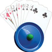 Once cards have been dealt, stack them together. Next insert between the two blue wheels. Using light pressure on the blue wheels, rotate them in opposing directions. The card holder will display the cards in a perfect fan.